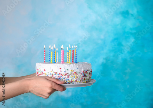 Delicious Birthday Cake With Candles On Blue Background Celebration